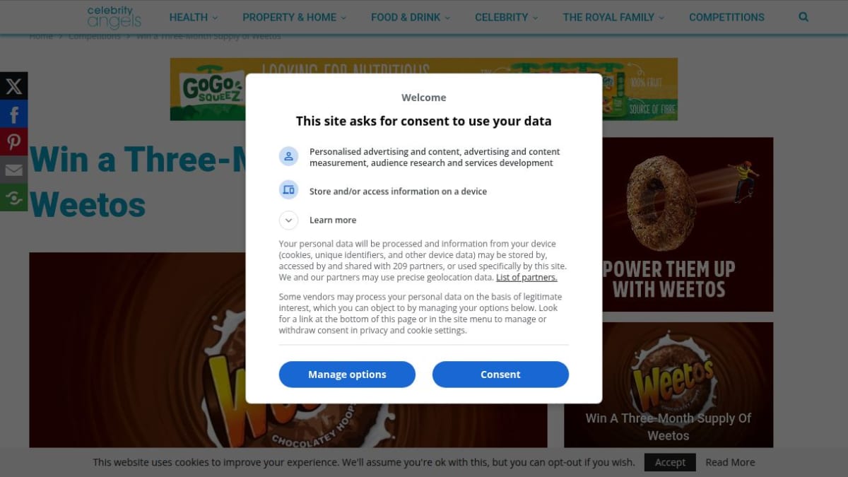 This prize consists of a three-month supply of Weetos cereal, equivalent to six boxes of the chocolatey hoop cereal. The cereal is made from wholegrain wheat and contains essential vitamins and iron.