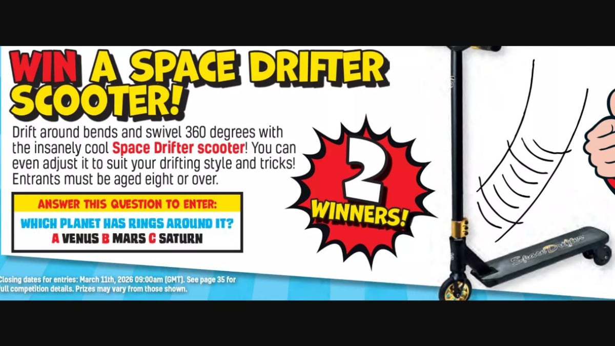 The prize is a Space Drifter Scooter, featured in Beano Issue 4325. This is an outdoor vehicle prize, likely intended for fun and recreation.