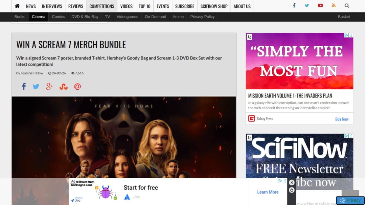 The prize bundle celebrates the release of Scream 7 and includes a signed poster, a branded T-shirt, Hershey’s treats, and the Scream 1-3 DVD Box Set. No cash alternative is offered for this prize.