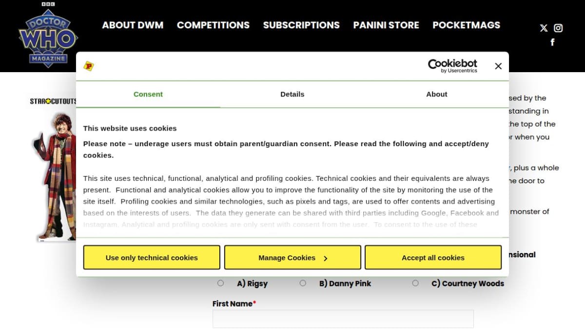 Five winners will receive a life-size cardboard standee featuring a Doctor, companion, or monster of their choice from the Star Cutouts range. These items allow fans to have a life-size cardboard cutout of their favorite character present.