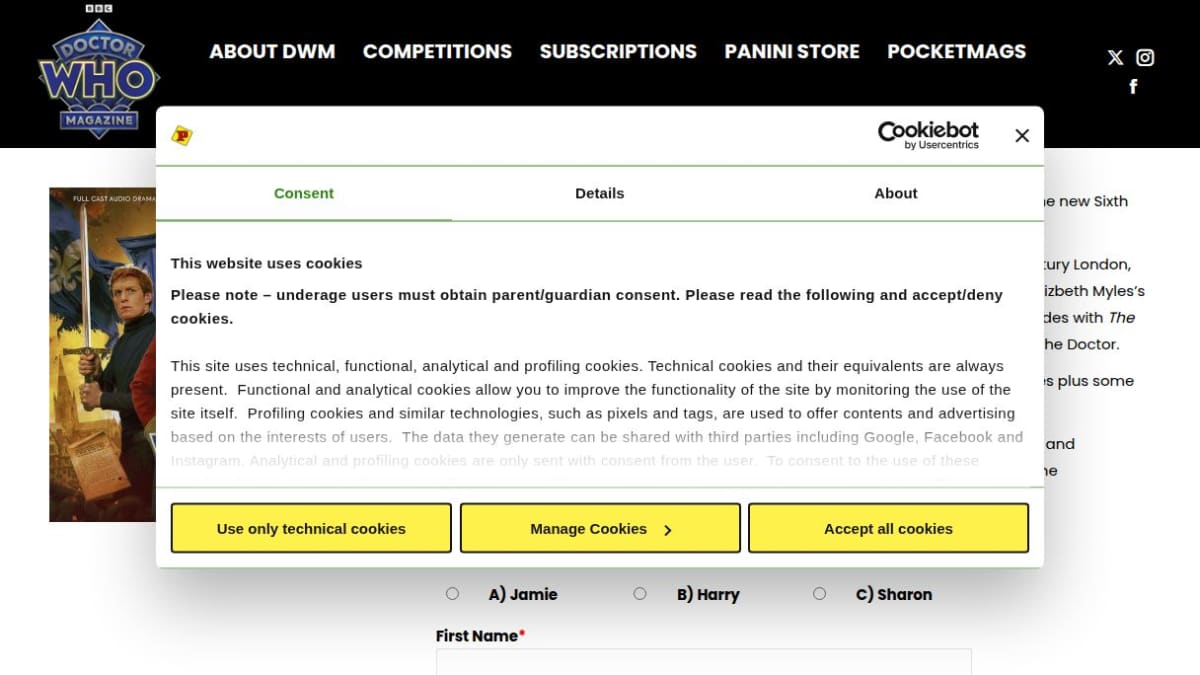 This prize is a set comprising three hour-long historical audio stories featuring the Sixth Doctor, Peri, and Turlough. The stories explore the psyches of the TARDIS regulars amidst historical settings like 17th-century London.