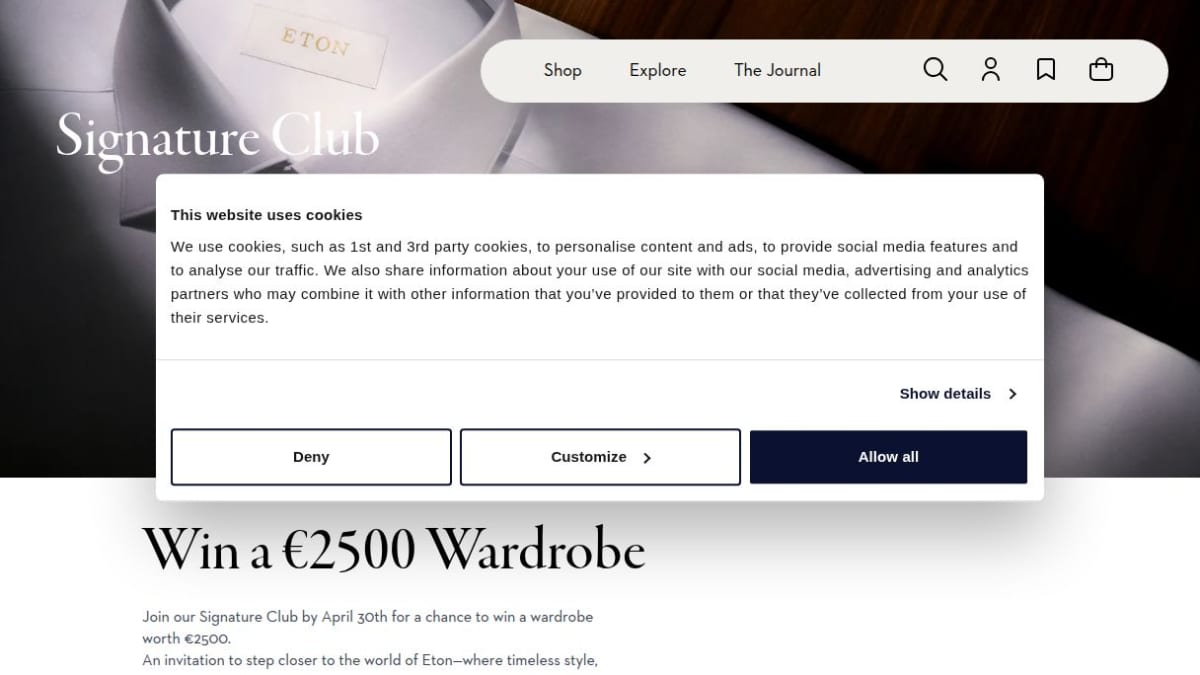 A chance to win a high-quality wardrobe from Eton Shirts, featuring timeless style and craftsmanship. This prize is valued at €2500 and is available to Signature Club members.