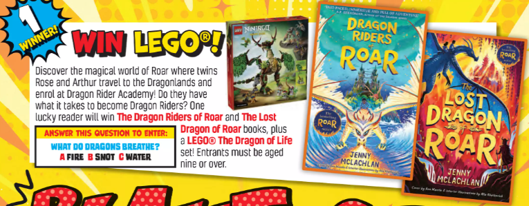 This prize package includes a Lego set with a dragon theme alongside accompanying books. It is offered as part of Beano Issue 4322.