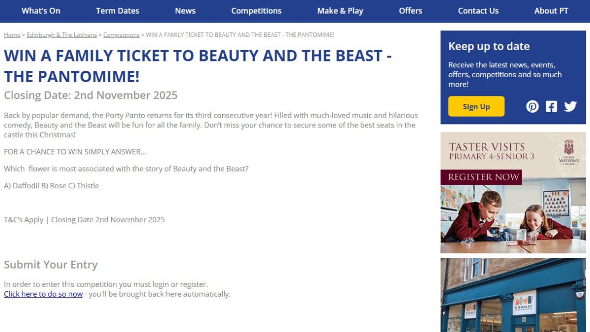 This prize is a family ticket to attend the pantomime production of Beauty and the Beast in Edinburgh. The show promises much-loved music and comedy suitable for all family members.