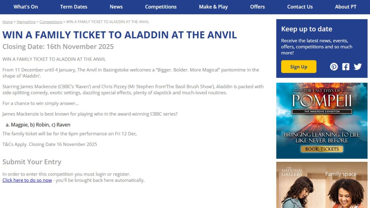 This prize is a family ticket for the pantomime 'Aladdin' being shown at The Anvil in Basingstoke. The performance will be the 6pm showing on Friday, December 12th.