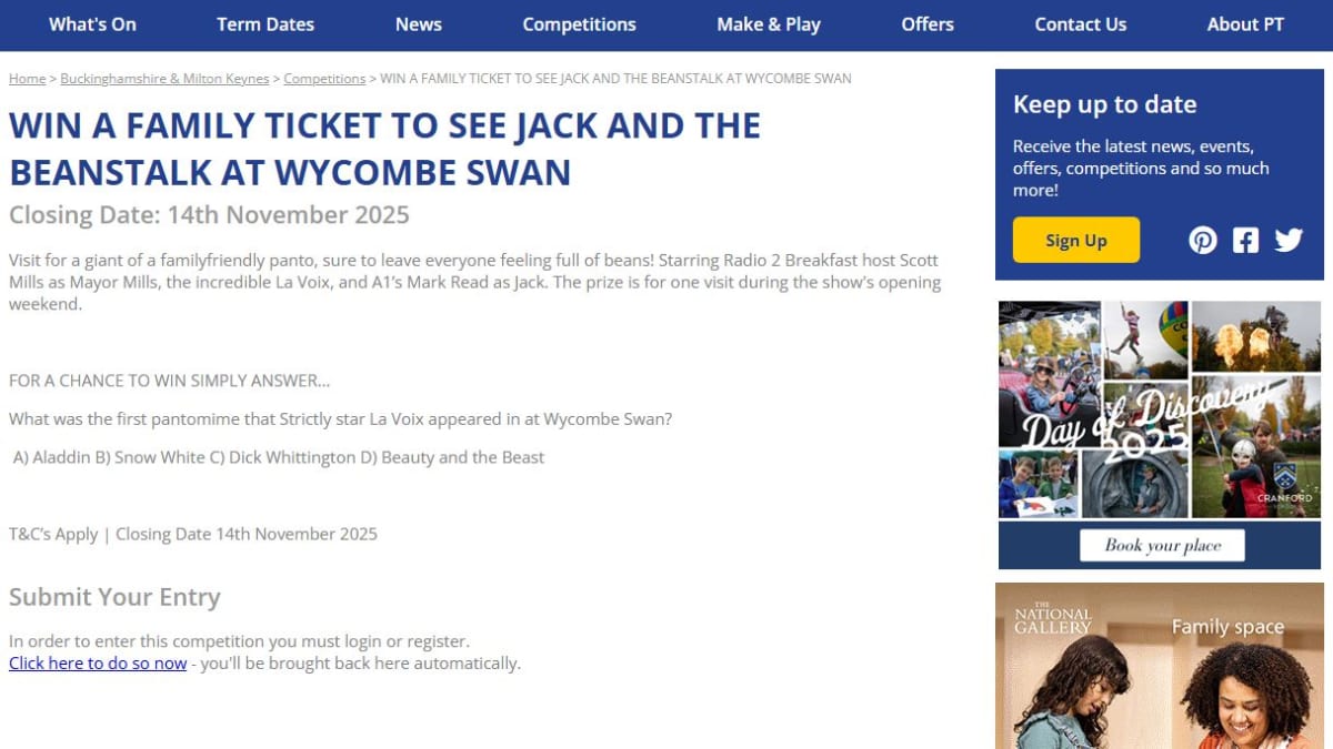 This prize is an admission ticket for a family to attend the pantomime performance of Dick Whittington and His Cat. The event takes place at the Gordon Craig Theatre.