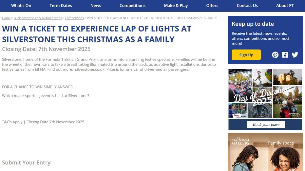 This prize allows a family to experience the Lap of Lights at Silverstone, where participants drive their own cars through an illuminated track spectacle synchronized to festive music. The experience features adaptive light installations and music broadcast via Elf FM.