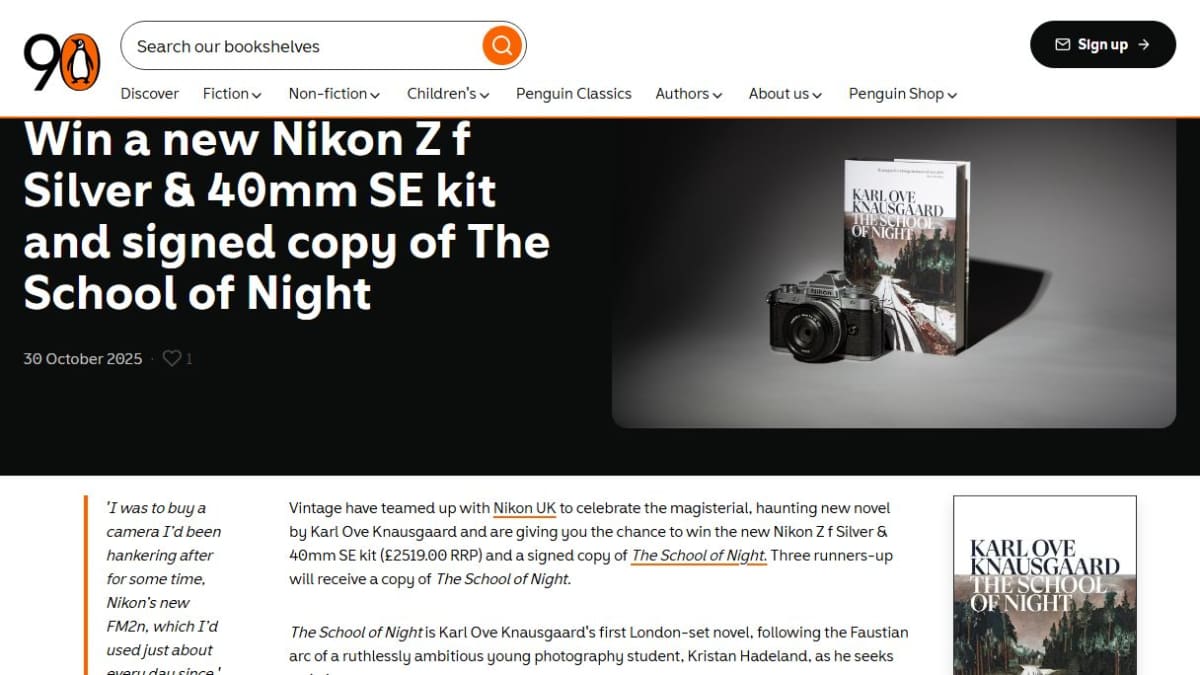 The grand prize includes a Nikon Z f Silver & 40mm SE kit, which has a recommended retail price of £2,519.00. Additionally, the winner receives a signed copy of the book 'The School of Night' by Karl Ove Knausgaard.