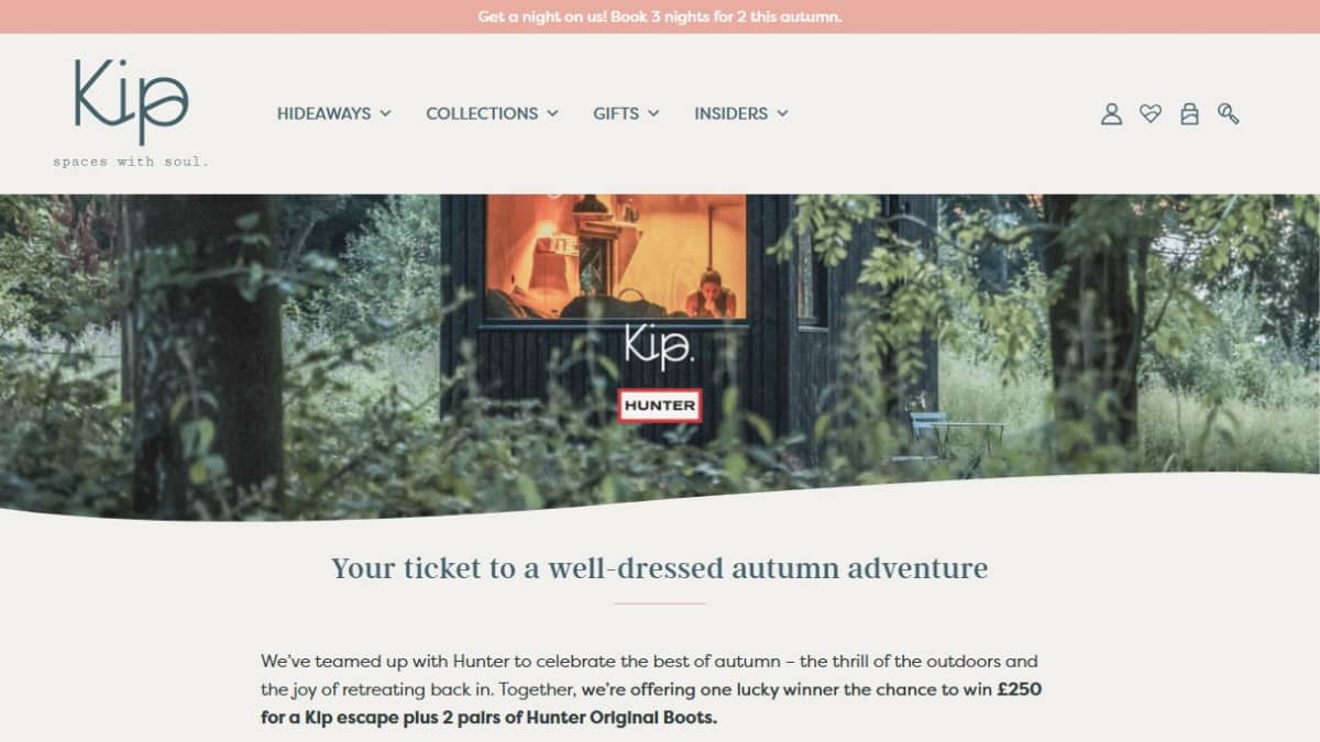 The prize package includes a £250 Gift Card for a Kip Hideaways escape applicable to any booking. The winner also receives two pairs of Hunter Original Boots, perfect for outdoor adventures.