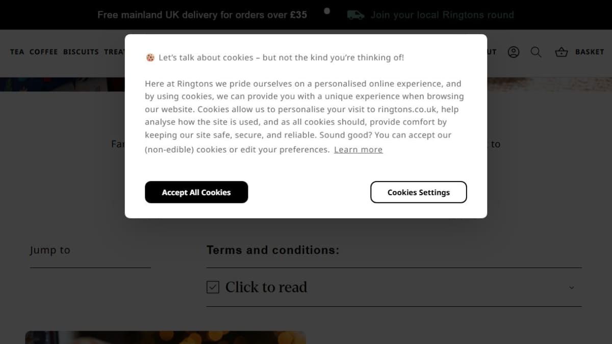 This prize is a collection of gourmet food items, including nuts, chocolates, condiments, puddings, biscuits, and hot chocolate. The hamper represents a selection of premium treats curated by Ringtons.