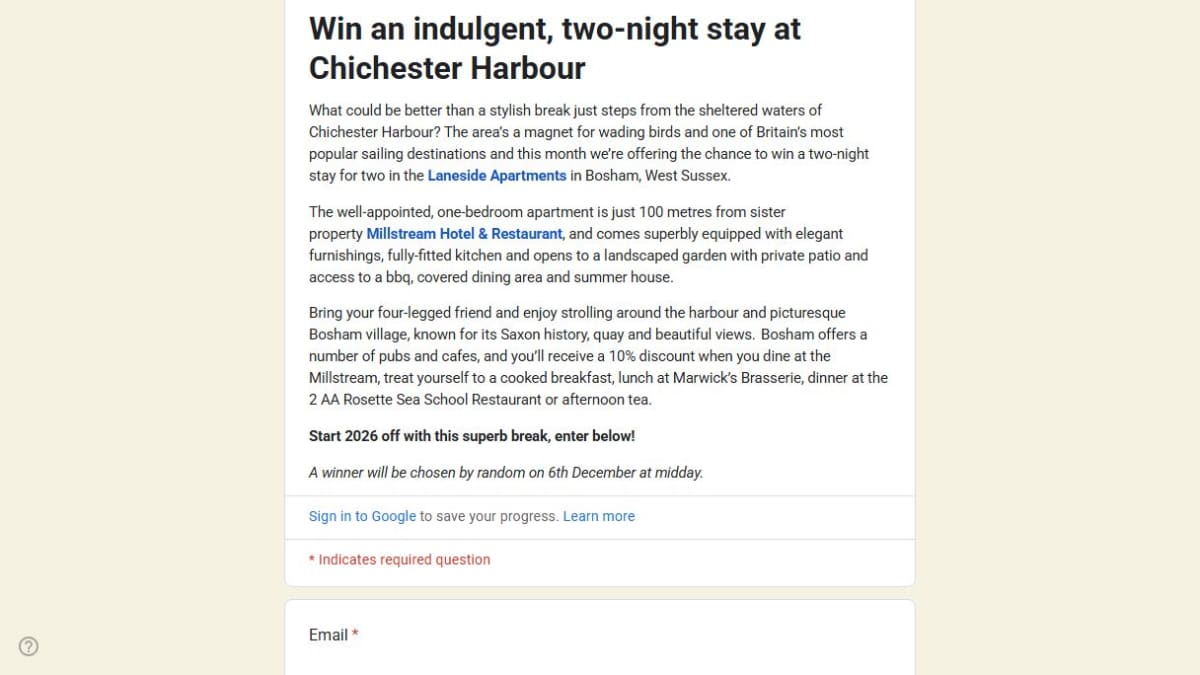 This prize includes an indulgent two-night stay for two people at the luxurious Laneside Apartments located in Bosham, West Sussex, near Chichester Harbour. The well-equipped one-bedroom apartment features elegant furnishings and access to a landscaped garden with a private patio.