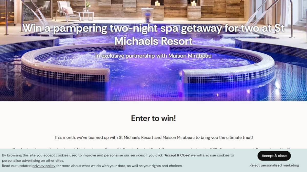 The grand prize includes two nights in a Luxury King room with a sundeck, a bottle of Prosecco, and a £60 dinner allowance. The package also features a 2-hour Hydrothermal Experience, a 55-minute deep tissue massage, and a 2-course lunch.