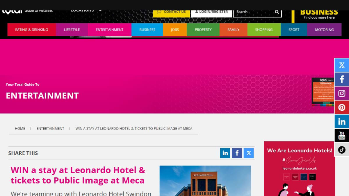 The prize includes a free overnight accommodation at Leonardo Hotel Swindon. It also provides two complimentary tickets to see the Public Image Ltd show at MECA.