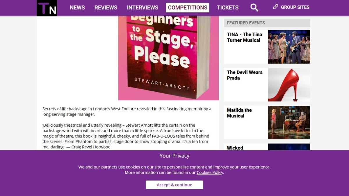This prize consists of three copies of the fascinating memoir 'Beginners to the Stage, Please' by Stewart Arnott. The book reveals the secrets of life backstage in London's West End theatre world, tracing the author's career from ticket tearing to stage managing The Phantom of the Opera.
