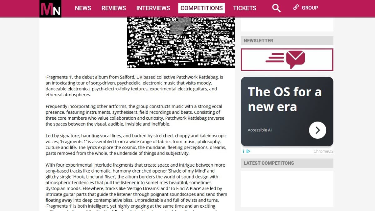 This prize includes copies of the debut album, 'Fragments 1', from the Salford-based collective Patchwork Rattlebag. The album delivers psychedelic, electronic music incorporating synthesisers, field recordings, and strong vocal lines.