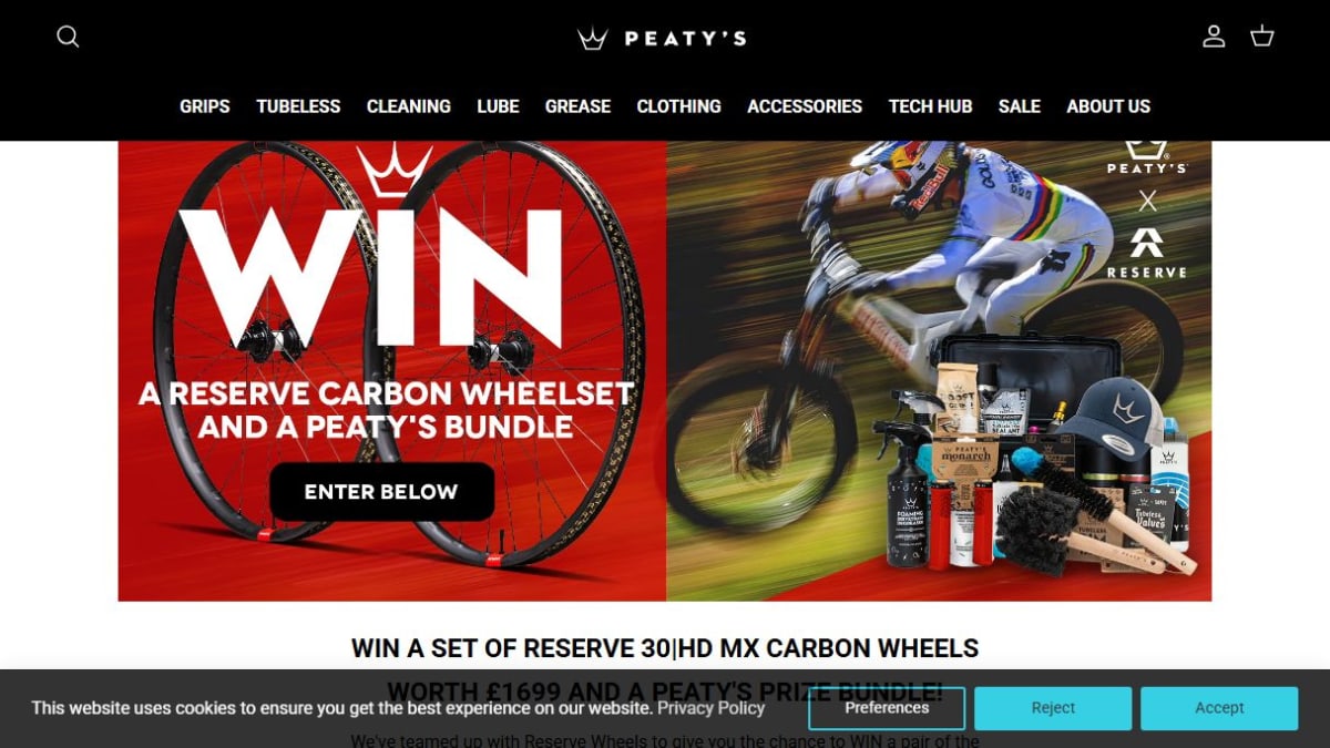 The main prize includes one pair of Reserve 30|HD MX wheels, which feature a specific hub configuration. Additionally, the winner secures a substantial bundle of products from Peaty's.
