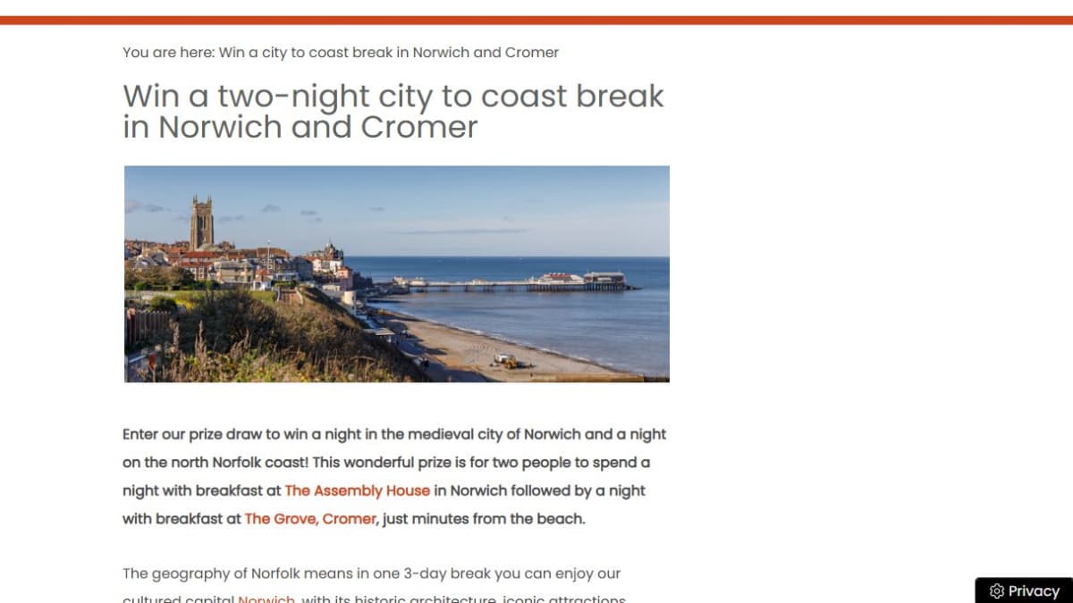 This prize offers two adults a memorable trip including one night with breakfast at The Assembly House in Norwich and a subsequent night with breakfast at The Grove in Cromer, situated near the beach. The vacation provides a blend of cultural city exploration and relaxing coastal enjoyment.