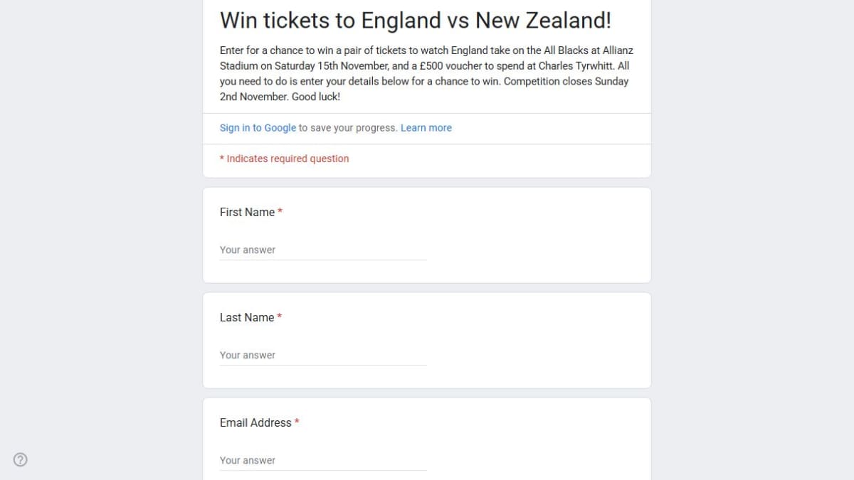 The prize includes a 500 value voucher to spend at Charles Tyrwhitt. Additionally, the winner receives two tickets to watch the England vs New Zealand rugby match at Twickenham on November 15th.