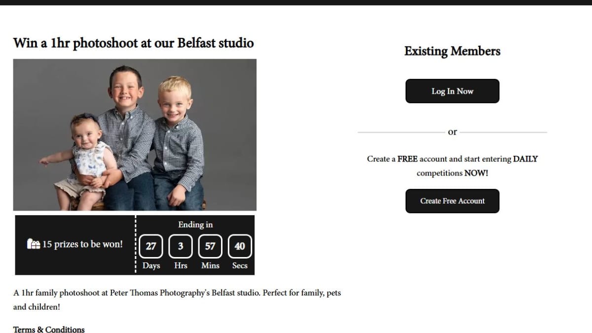 This prize includes a one-hour professional photoshoot session conducted at the Peter Thomas Photography studio located in Belfast. It is suitable for capturing memories of family, children, or pets.