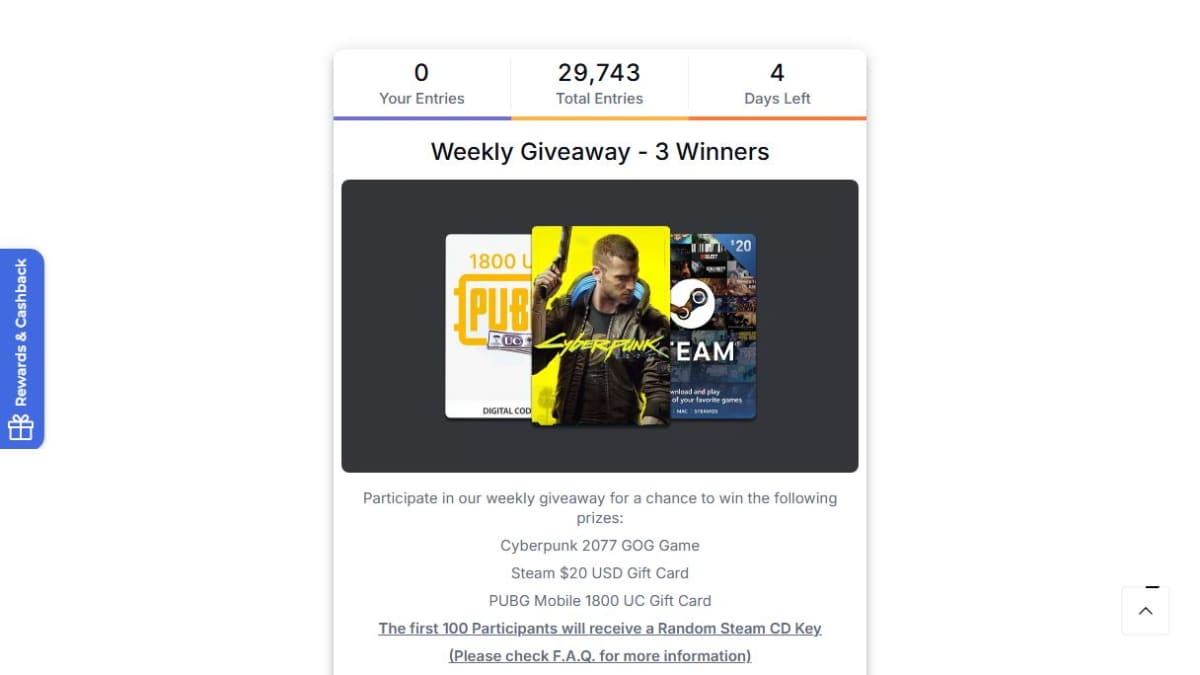 Prizes for the weekly giveaway include the Cyberpunk 2077 GOG Game, a $20 USD Steam Gift Card, or a 1800 UC Gift Card for PUBG Mobile. There is also a chance for the first 100 participants to receive a random Steam CD Key.