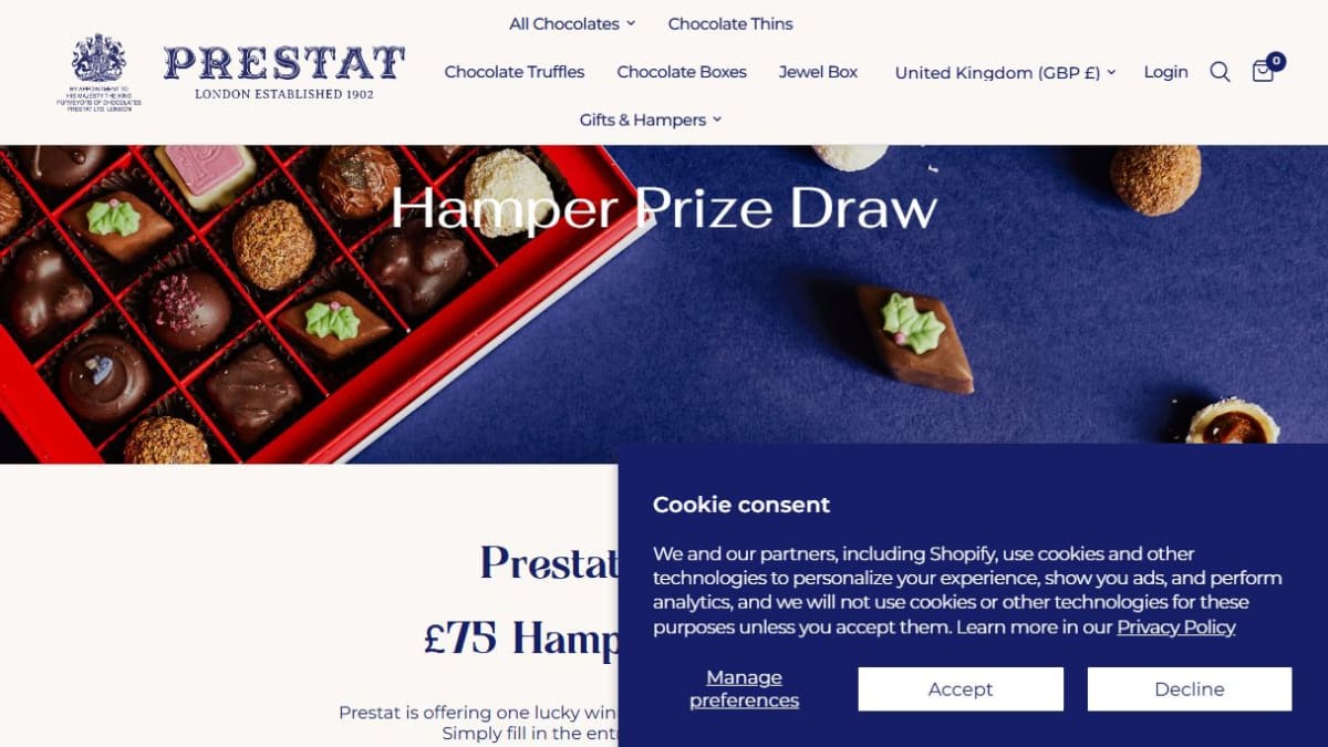 A hamper filled with assorted Prestat chocolates. The hamper has an approximate value of £75.