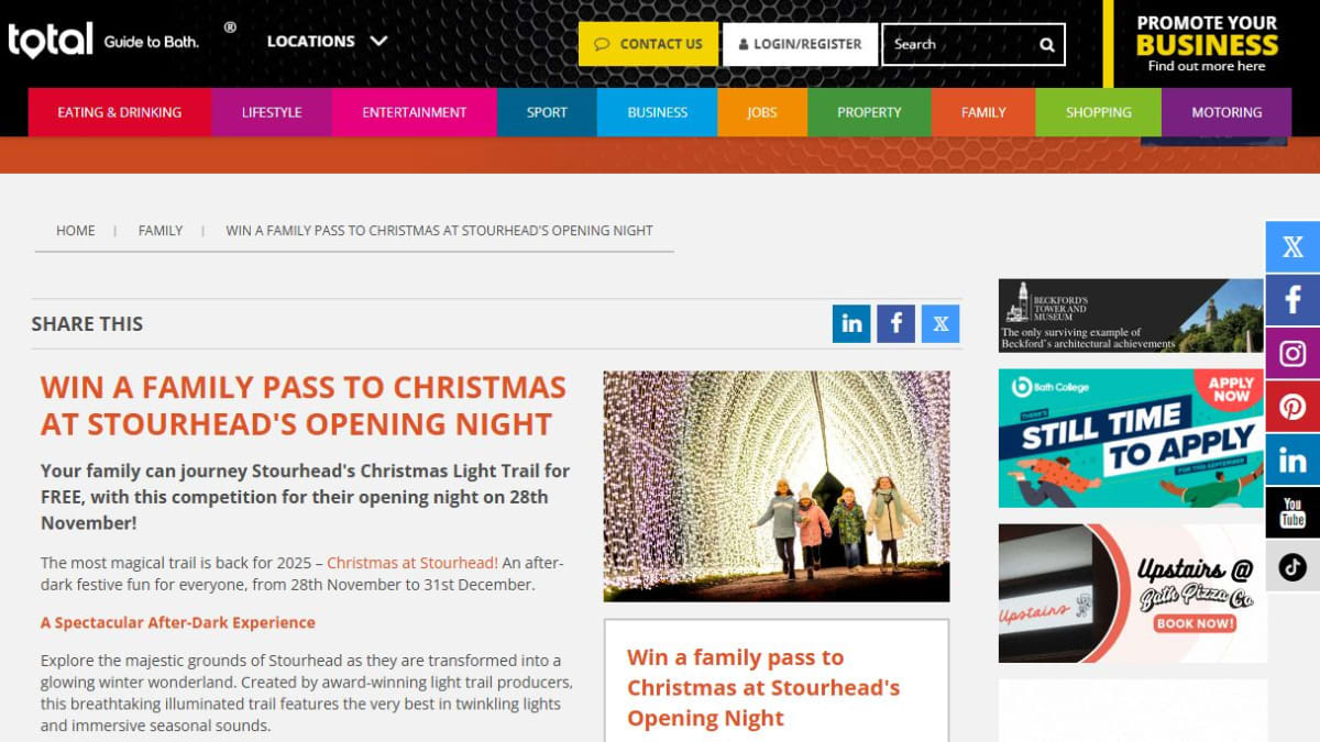 This prize includes a family pass to experience the Christmas light trail at Stourhead. The pass grants admission for the opening night on November 28th.