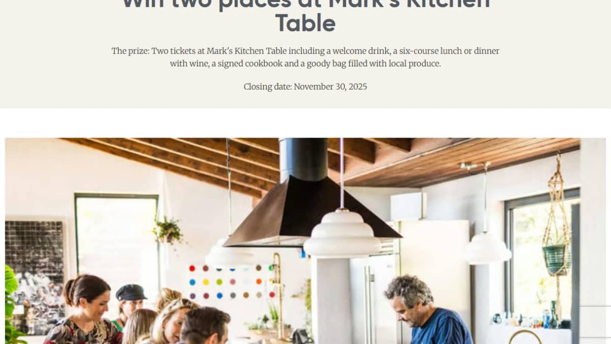 This prize includes two places at Mark's Kitchen Table, a six-course meal with wine, a signed cookbook, and a goody bag with local produce. Guests enjoy the experience in the chef's home with breathtaking coastal views.