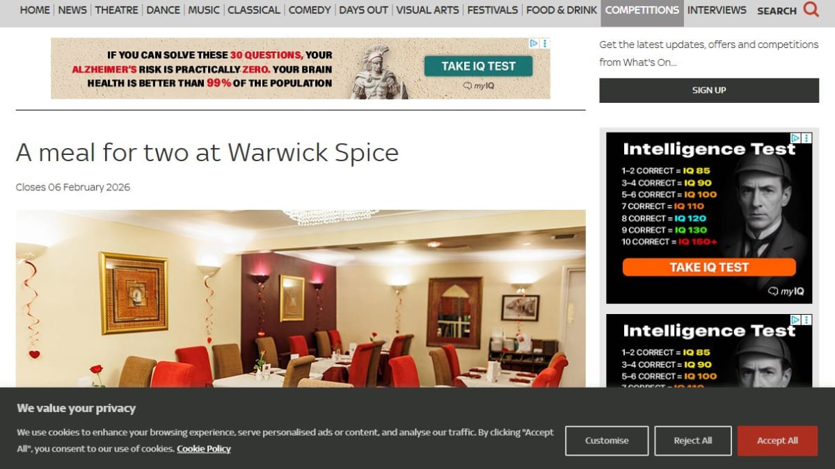 The winner receives a complimentary meal for two at Warwick Spice, which also includes a bottle of wine or two alternative drinks. The experience must be redeemed by the end of March 2026, subject to restaurant availability.