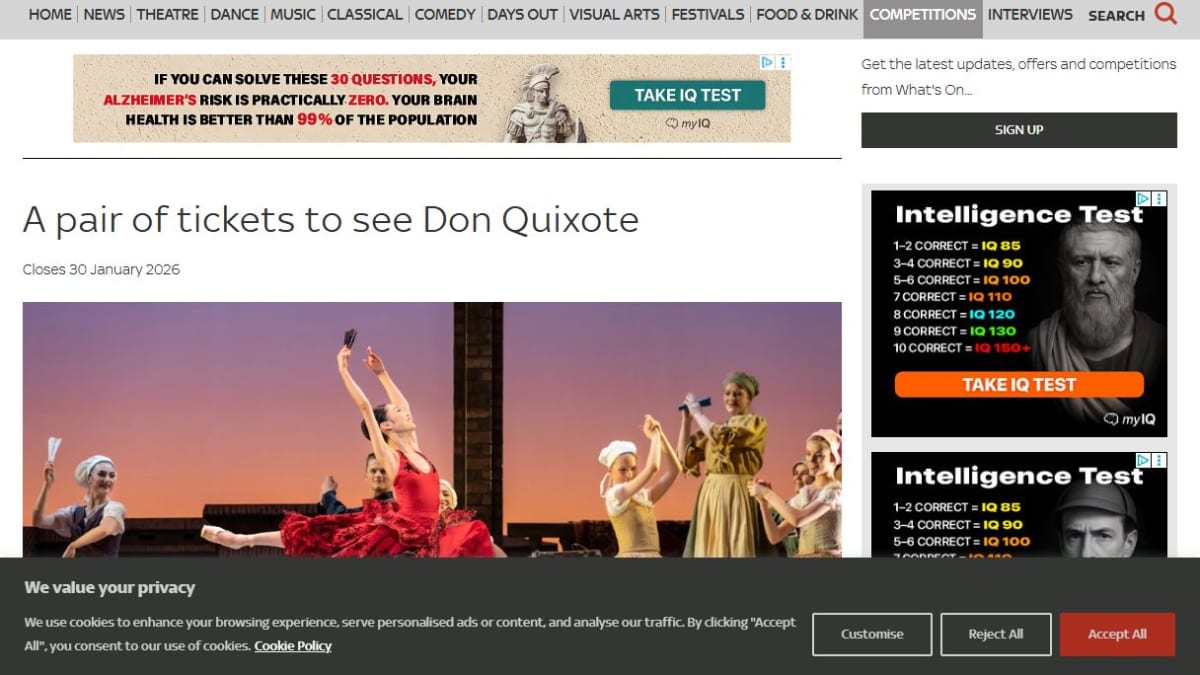 A pair of tickets is being offered to see the Birmingham Royal Ballet's production of Don Quixote at the Birmingham Hippodrome. This performance features spectacular dance and vivacious comedy.