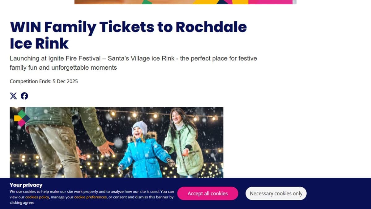 This prize includes two adult tickets and three child tickets for a 45-minute ice skating session at Rochdale Ice Rink. The tickets are valid for a day of the winner's choice during the operating period of Santa’s Village.