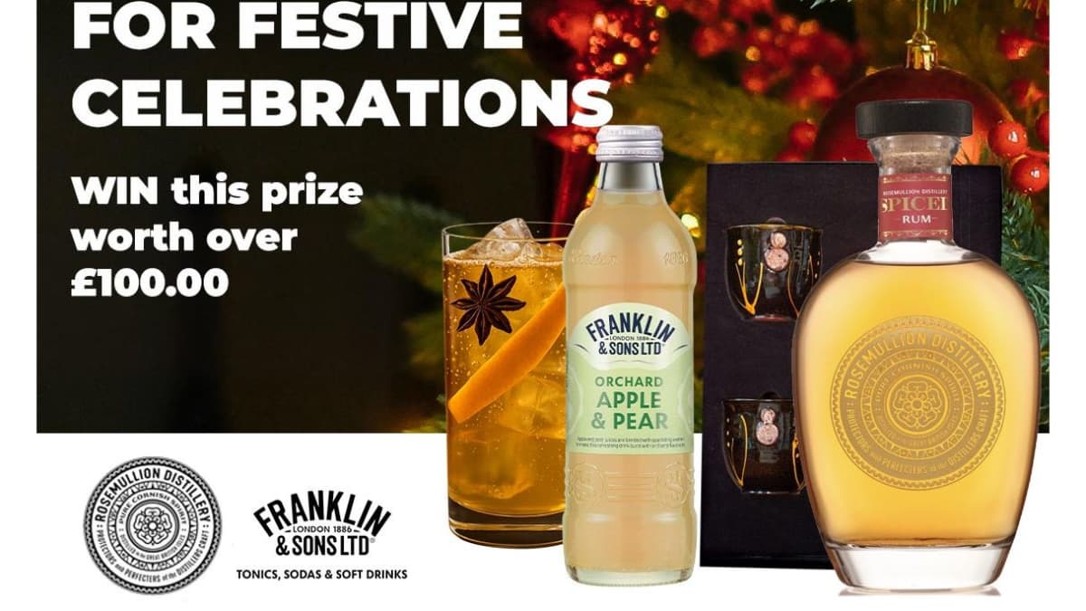 This combined prize includes two cases of Franklin & Sons Apple and Pear soft drink along with a Rosemullion Distillery gift set featuring a 70cl bottle of Spiced Rum and two handmade ceramic drinking vessels. The collection is designed to help create a perfectly festive spiced apple/strudel flavored cocktail.