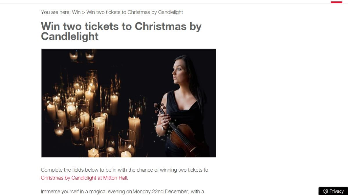 This prize grants admission for two people to experience Christmas by Candlelight at Mitton Hall. The event features a candlelit concert performed by the Northern String Quartet.