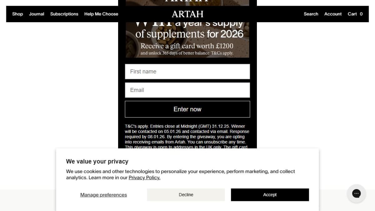 The prize is described as a Year's Supply of Supplements from ART AH. Additionally, the terms mention a gift card valued at £1200 which expires at the end of 2026.