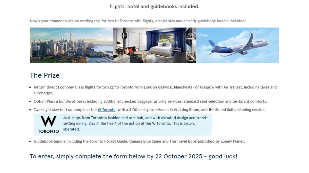 This prize includes return flights for two to Toronto, a two-night stay at the W Toronto hotel, a $100 dining experience, and a one-hour sound suite session. A guidebook bundle is also provided.