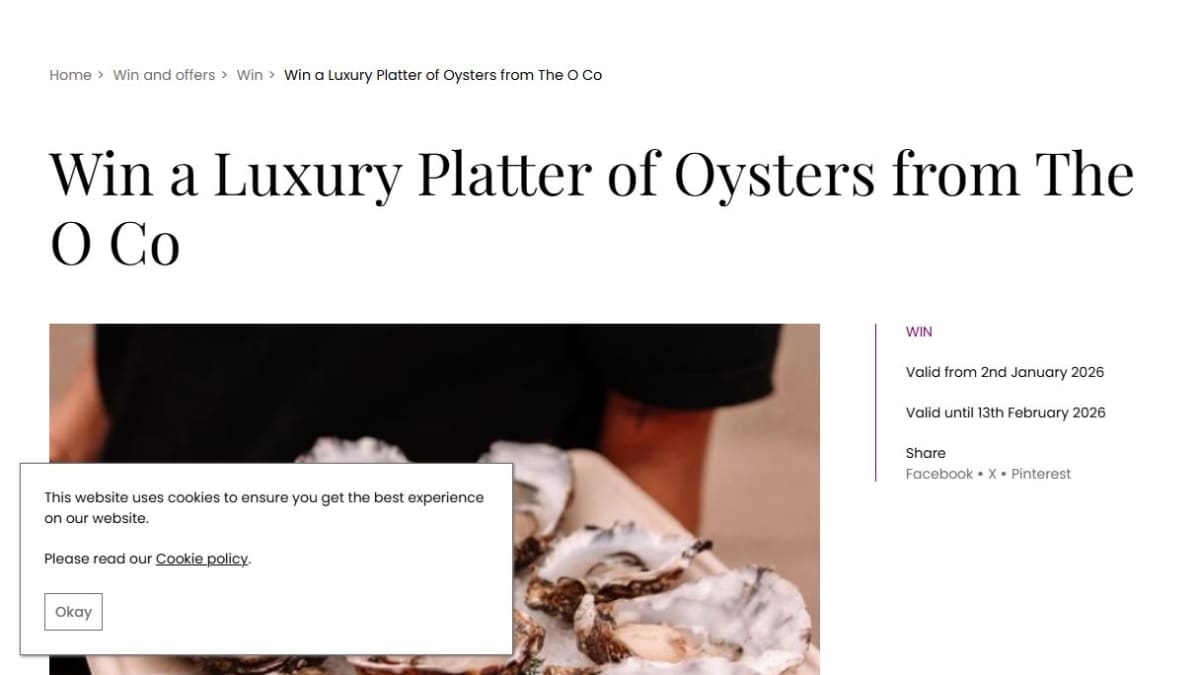 This prize consists of a luxury platter featuring fresh oysters from The O Co. The offering may also include scallops and various creative toppings inspired by classic and gourmet preparations.