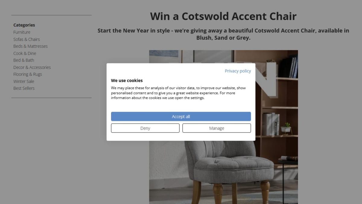 This prize is a beautiful Cotswold Accent Chair designed to bring effortless style and comfort to any living area, hallway, or bedroom. The winner can choose their preferred color from Blush, Sand, or Grey.