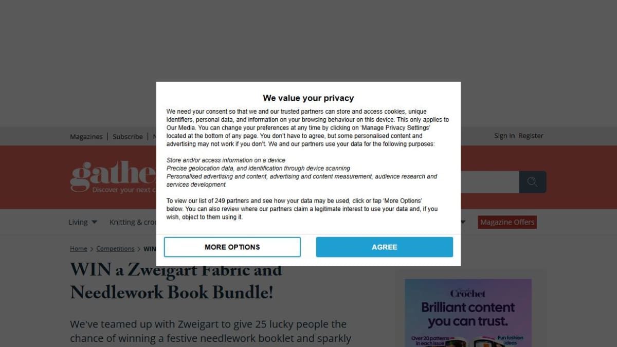 This prize includes pre-cut sections of 14-count gold sparkly fabric from Zweigart, paired with a festive needlework booklet. The bundle is designed to enhance stitching and crafting projects.