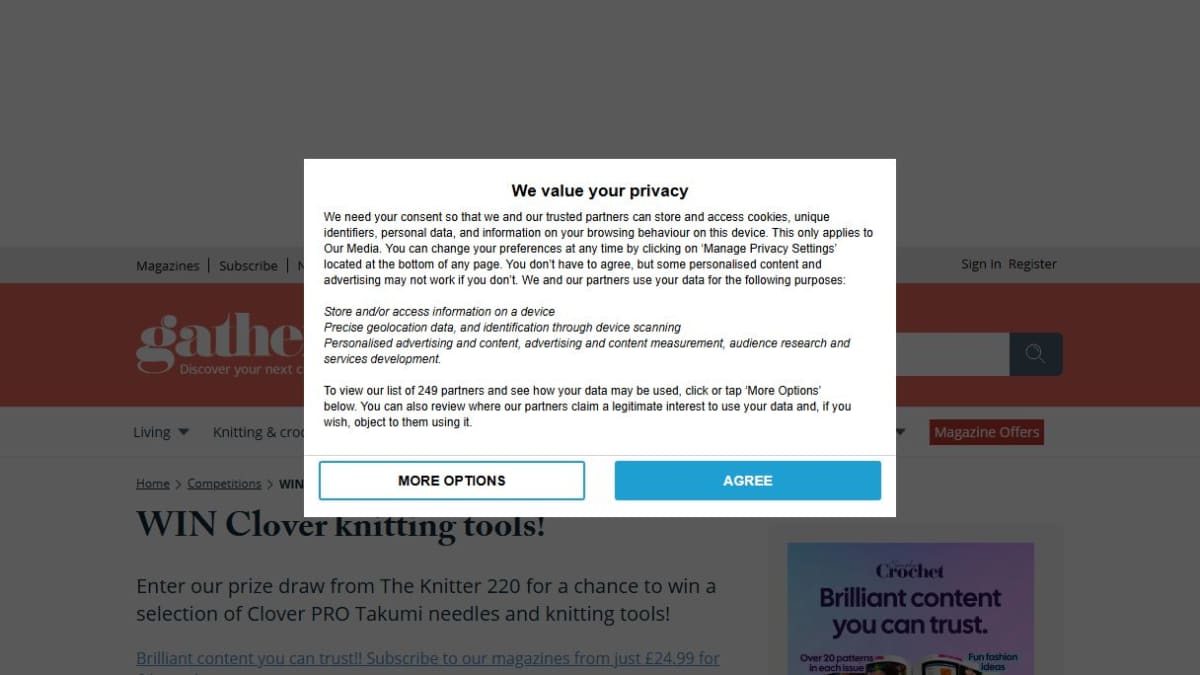 This prize bundle features six sets of Clover PRO Takumi bamboo circular knitting needles in various sizes. It also includes several essential knitting accessories like a yarn ball winder, swatch ruler, needle gauge, and pom-pom maker set.