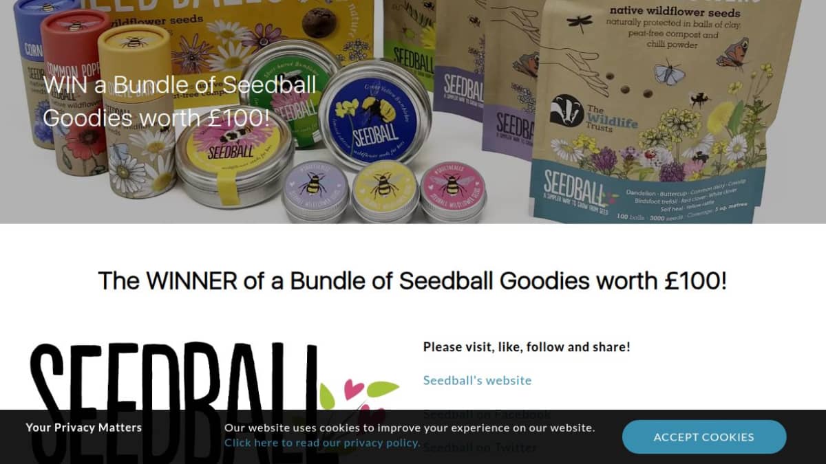 This prize includes a substantial collection of Seedball products, featuring 530 seed balls in various mixes like Shade, Wildlife, and Lawn Flowers. The contents consist of multiple grab bags, tubes, tins, and a make-your-own kit, offering enough coverage for up to 25 square meters.