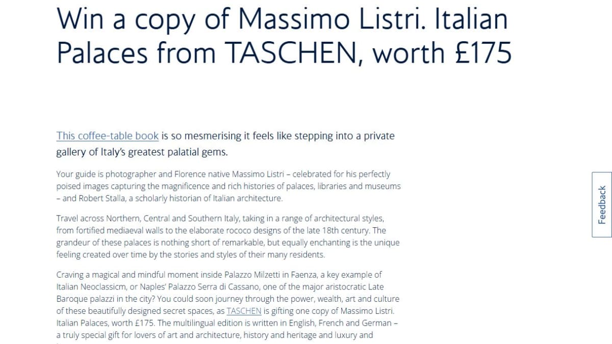 This prize is a coffee table book by Massimo Listri showcasing stunning photography of Italian palaces. The book offers a glimpse into grand European architecture and interior design.