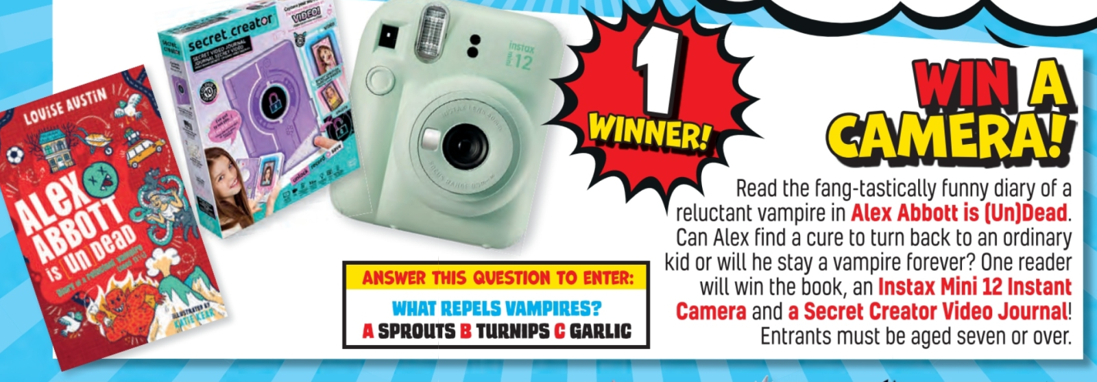 The prize bundle includes an Instax Mini 12 instant camera, a video journal, and Issue 4333 of the Beano comic.