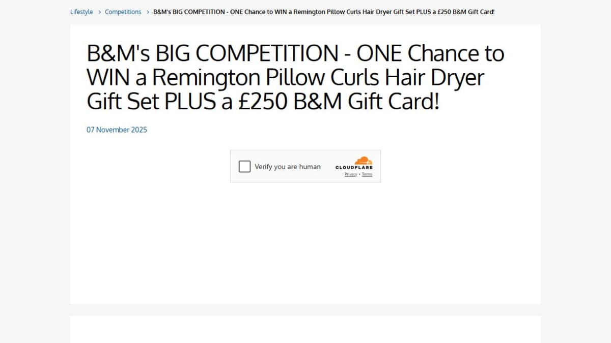 This prize package includes a £250 gift card for B&M stores alongside a Remington Pillow Curls Hair Dryer Gift Set. The gift card can be used for various items available at B&M, and the hair dryer set offers a styling tool for personal grooming.