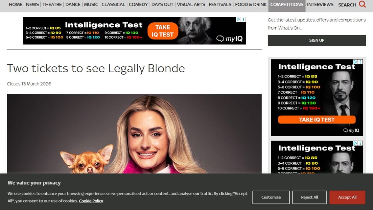 A pair of tickets is offered to see Legally Blonde The Musical performed at The Alexandra in Birmingham. This production follows Elle Woods's transformation as she navigates Harvard Law School.