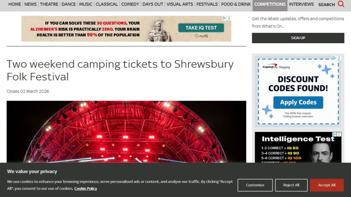 This prize includes two weekend camping tickets for the Shrewsbury Folk Festival scheduled for August 28th to 31st. The festival features folk and roots music performers across four stages at the riverside West Mid Showground.