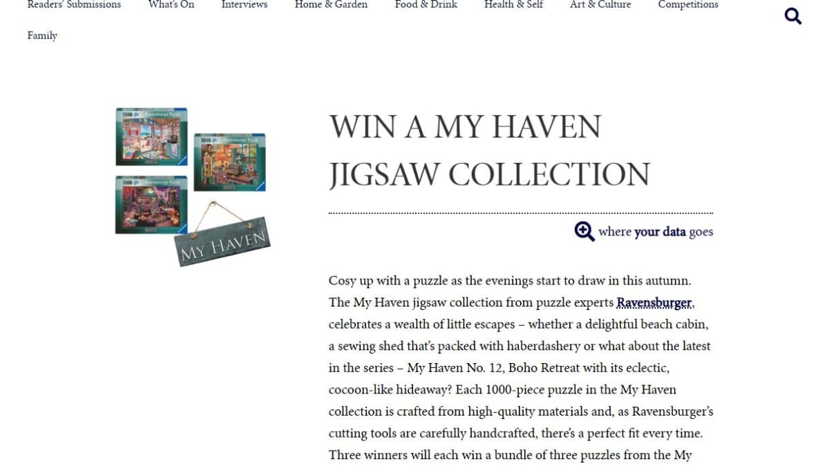 This collection includes three 1000-piece jigsaw puzzles from Ravensburger's My Haven series, known for high-quality materials and precise cuts. Puzzles feature relaxing themes such as beach cabins and bohemian retreats.