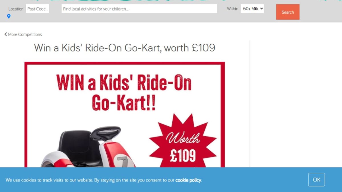 The prize is a Zoom 6V electric go-kart, inspired by arcade racing games, suitable for youngsters. It features a 6V 4.5Ah battery and smooth handling for safe, thrilling fun.