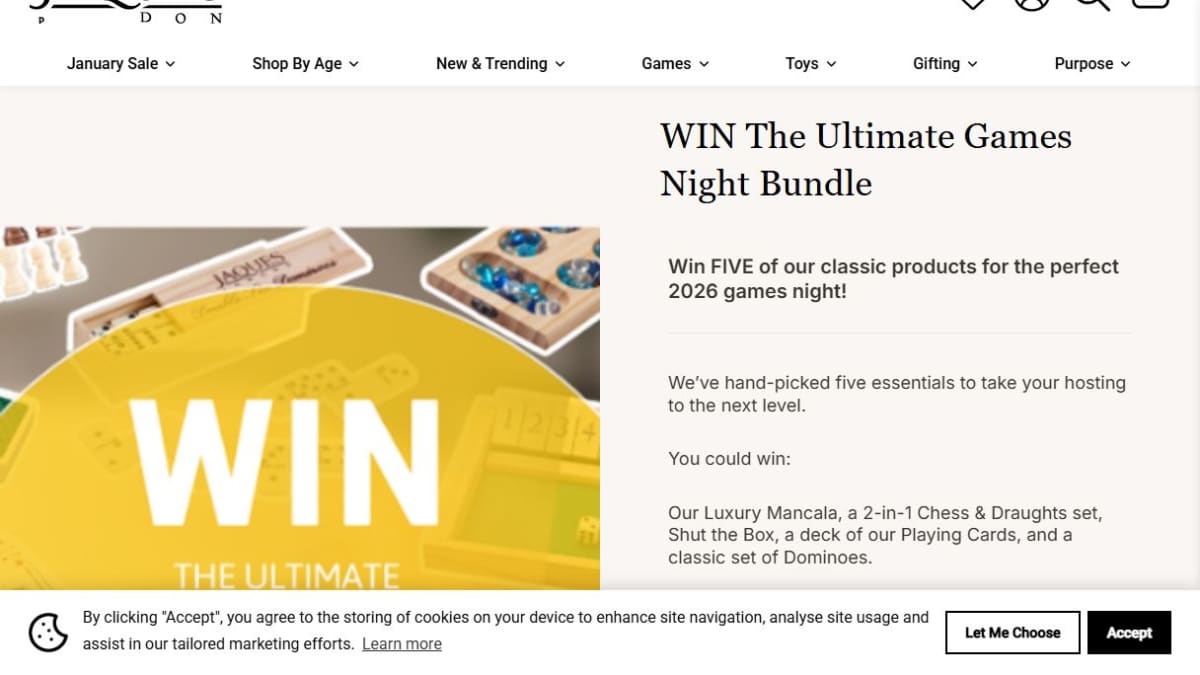 This prize package includes five classic games from Jacques of London, such as Luxury Mancala, a 2-in-1 Chess & Draughts set, Shut the Box, Playing Cards, and Dominoes. These items are suitable for an enjoyable family games night.