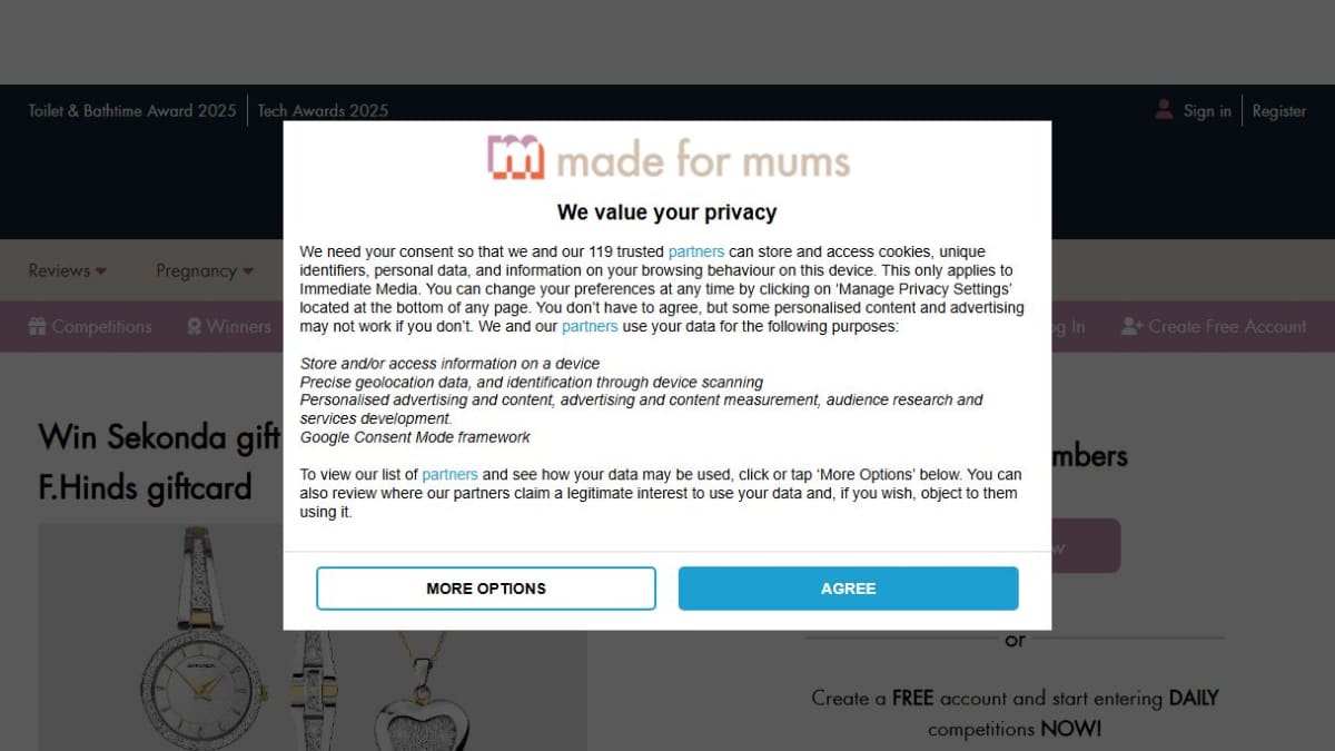 The main prize includes a Sekonda watch and jewellery gift set featuring a gold and silver tone watch, necklace, and bangle. This is complemented by a £100 gift card to spend at F.Hinds stores or online.